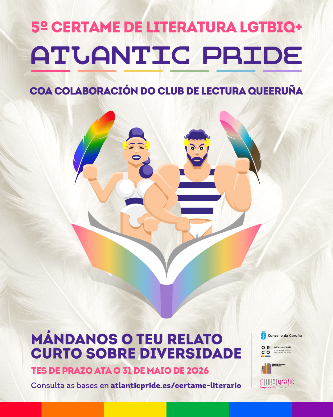 O V Certame de Literatura LGTBIQ+ do Atlantic Pride pretende visibilizar as diversidades sexuais e de xénero e vivenciar as experiencias minorizadas de todas as persoas LGTBIQ+. As obras deberán ser en galego, orixinais e inéditas, de temática libre e con vinculación á diversidade LGTBIQ+, e poderán presentarse até o 31 de maio, optado a tres premios en metálico (de 600, 300 e 100€).