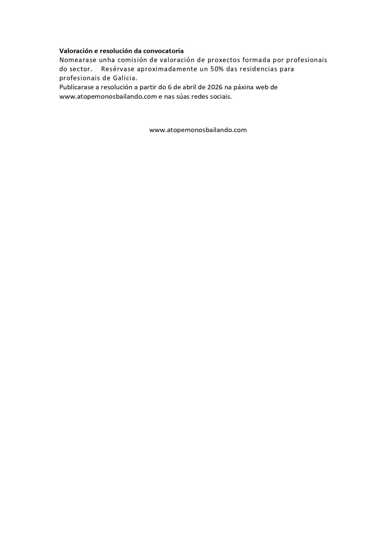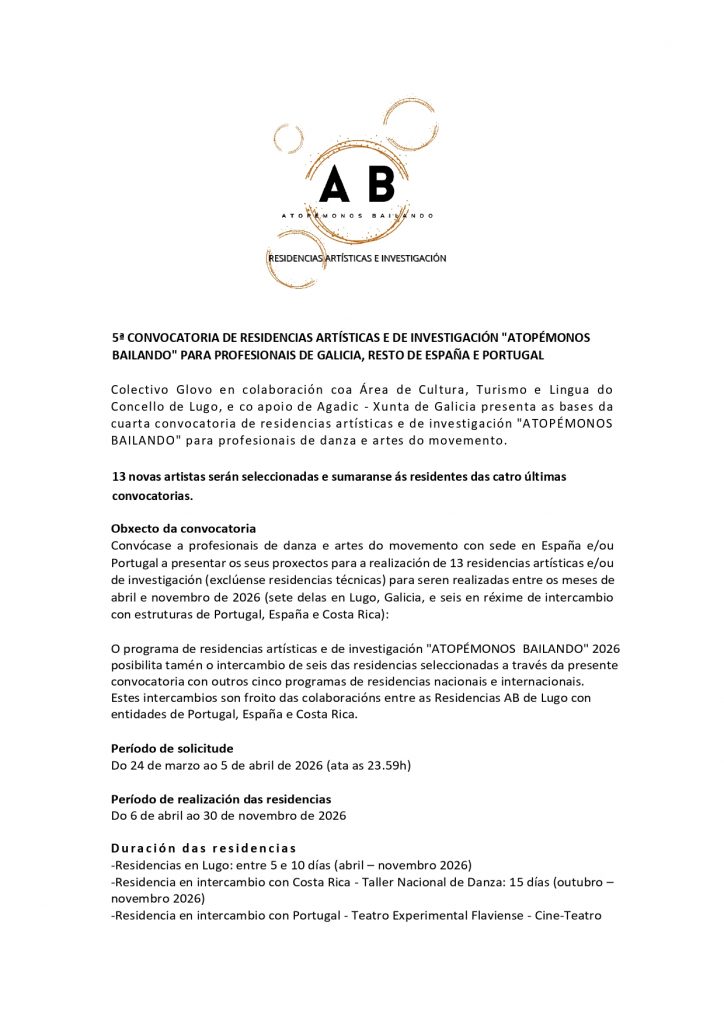 Convocatoria Programa de Residencias Artísticas e Investigación ATOPÉMONOS BAILANDO 2026 por martinho | Mar 24, 2026 | Autores/as, Creación, Novas, Outras Artes, Xeral CONVOCAT.-AB-2026-GAL