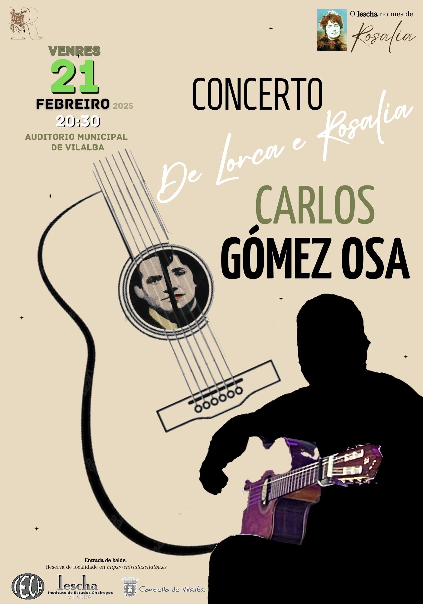 Continuando coa programación prevista para este mes de febreiro co gallo da homenaxe a ROSALÍA DE CASTRO, o Instituto de Estudos Chairegos, coa colaboración do Concello de Vilalba, organiza o CONCERTO DE CARLOS GÓMEZ OSA: “DE LORCA E ROSALÍA” .