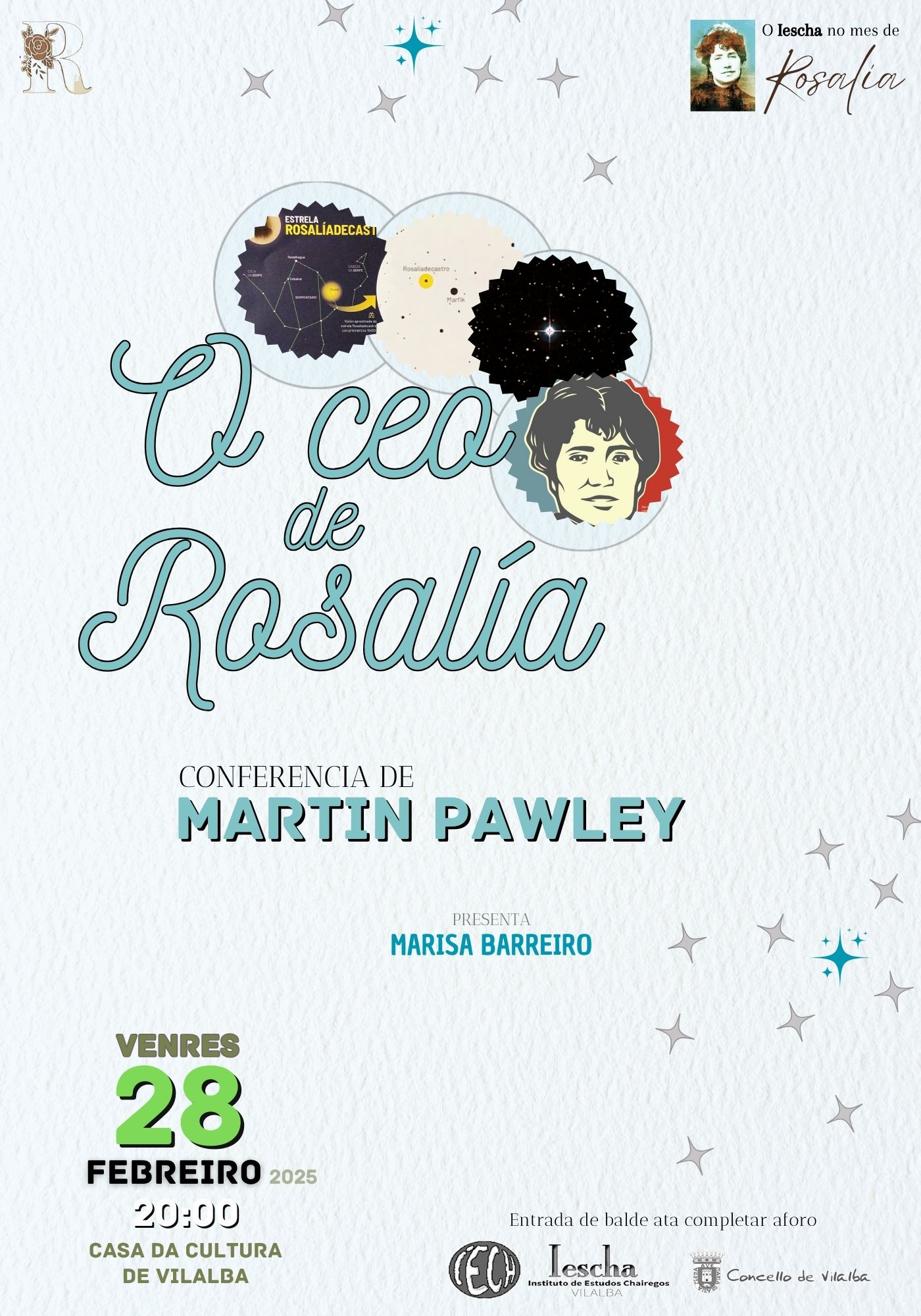 Culminando a programación prevista para este mes de febreiro co gallo da homenaxe a ROSALÍA DE CASTRO, o Instituto de Estudos Chairegos, coa colaboración do Concello de Vilalba, organiza a CONFERENCIA de MARTIN PAWLEY: “O CEO DE ROSALÍA”. A presentación correrá a cargo da presidenta do IESCHA, Marisa Barreiro.