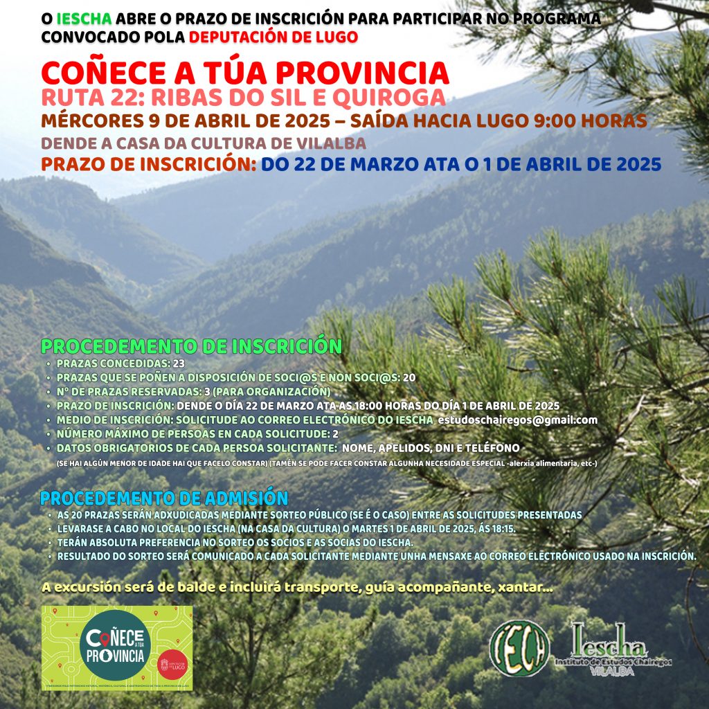 O Instituto de Estudos Chairegos (IESCHA) foi admitido para participar no Programa “Coñece a túa Provincia’2025”, convocado pola Deputación de Lugo, co seguinte CONTIDO (sempre suxeito a algún cambio):