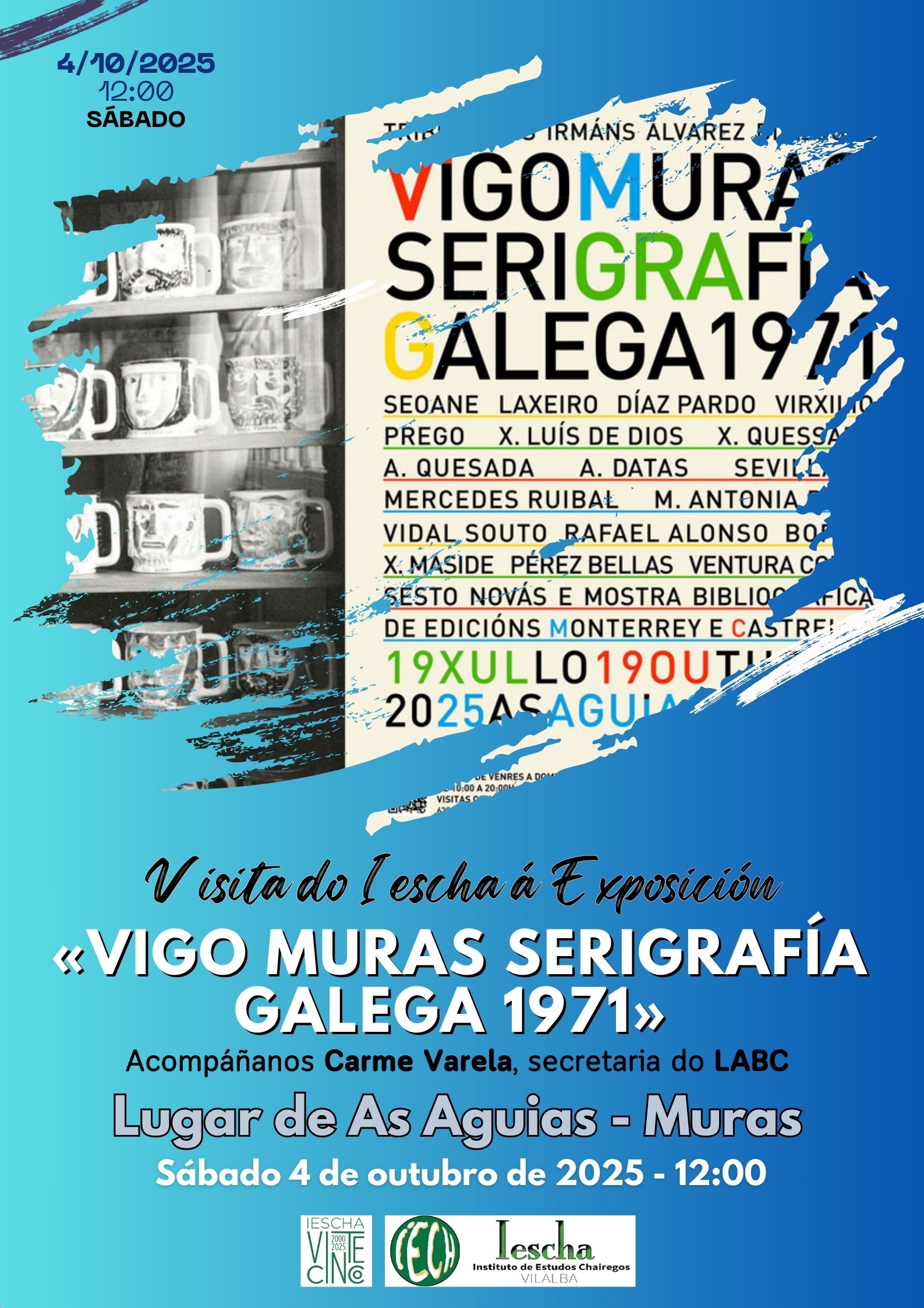 O vindeiro sábado 4 de outubro de 2025, o Instituto de Estudos Chairegos (IESCHA) ten previsto visitar, no lugar de AS AGUIAS-MURAS, a exposición “Vigo-Muras Serigrafía Galega 1971”, un tributo aos irmáns Álvarez Blázquez que acerca ao público 41 serigrafías saídas dos talleres da Serigrafía Gallega (Sega), fundada en Vigo por Álvaro Álvarez Blázquez, e expostas por primeira vez en Galicia en 1971.