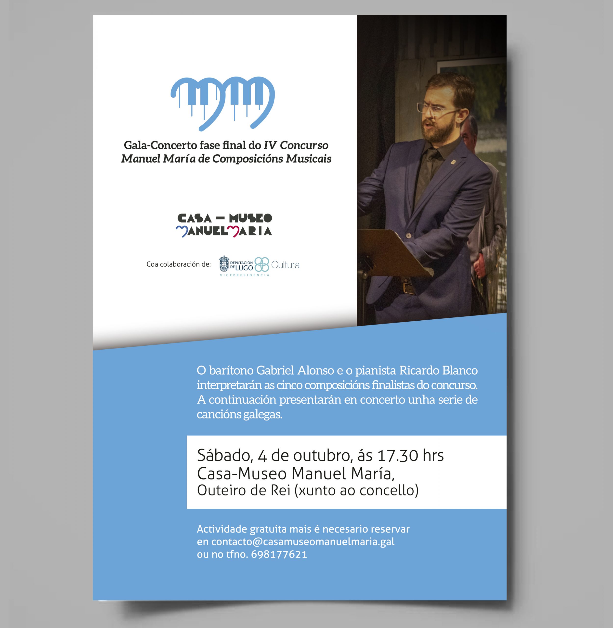 A Casa-Museo Manuel María celebra este sábado, 4 de outubro, ás 17.30 hrs, a gala-concerto da fase final da IVª edición do Concurso Manuel María de Composicións Musicais. A esta fase final accederon cinco pezas seleccionadas entre o conxunto das presentadas a concurso: Tenrura, O meu barco, Nas leves tardes de Outono, Eu son de Outeiro de Rei e Alborada, compostas por Manuel Pacheco Sánchez, Luis Serrapio Fernández, Yónatan Sánchez Santianes, Manuel María Veiga Lombardía e Xosé Alfredo Oliveira Pérez.