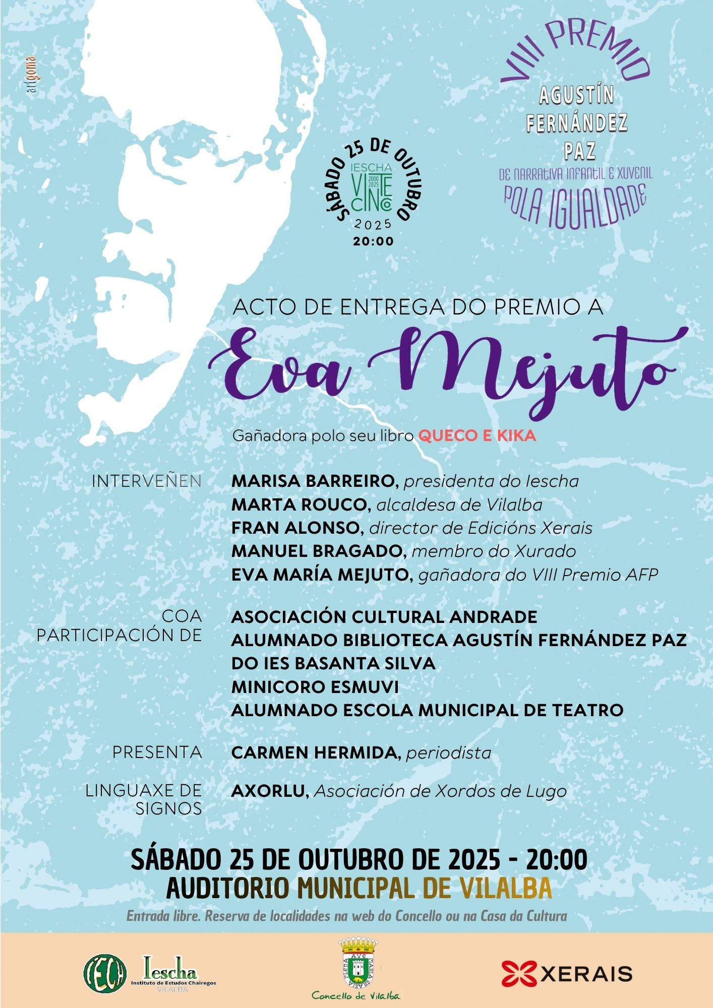 O Instituto de Estudos Chairegos, o Concello de Vilalba e Edicións Xerais de Galicia organizan o acto de entrega do VIII Premio Agustín Fernández Paz de narrativa infantil e xuvenil pola Igualdade á escritora gañadora, EVA Mª MEJUTO, polo seu libro “QUECO E KIKA”, que terá lugar o sábado 25 de outubro de 2025, ás 20:00 horas, no AUDITORIO MUNICIPAL DE VILALBA.