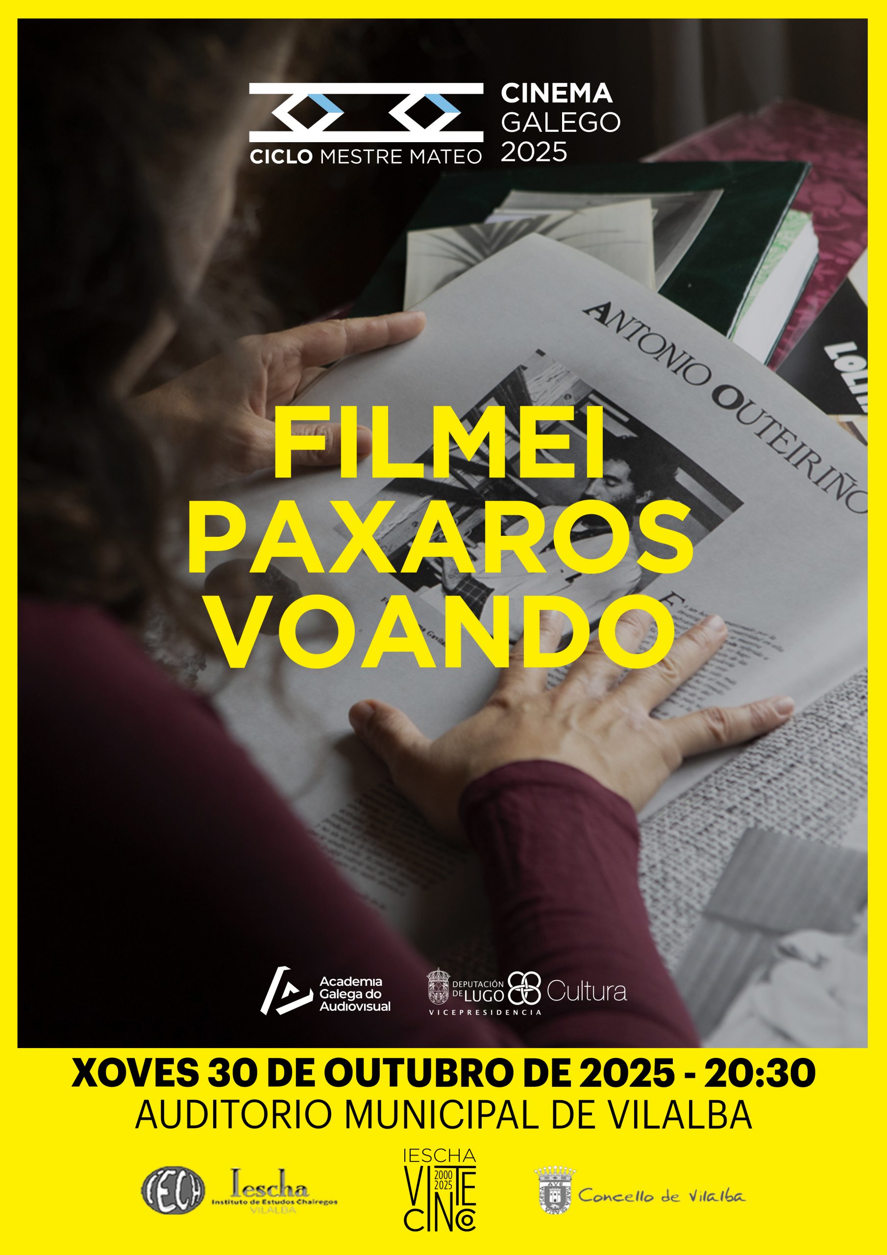 O Instituto de Estudos Chairegos (IESCHA), en colaboración coa Área de Cultura-Vicepresidencia da Deputación de Lugo, Academia Galega do Audiovisual e o Concello de Vilalba, organiza a proxección da longametraxe documental FILMEI PAXAROS VOANDO, dirixida por Zeltia Outeiriño, continuando así co CICLO MESTRE MATEO-2025 que durante estes meses brídanos a oportunidade de poder disfrutar das películas finalistas (documentais, longametraxes e curtas) dos XXIII PREMIOS MESTRE MATEO.