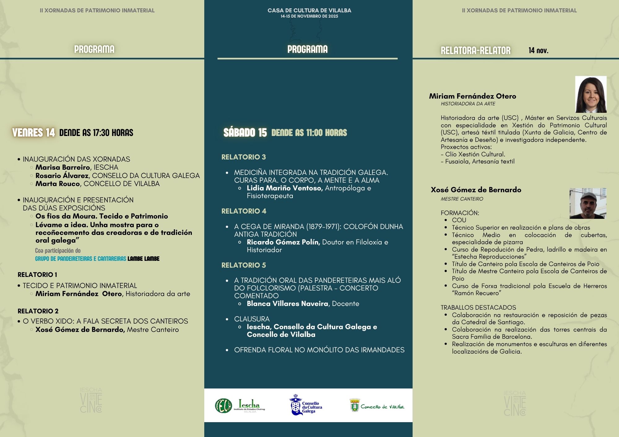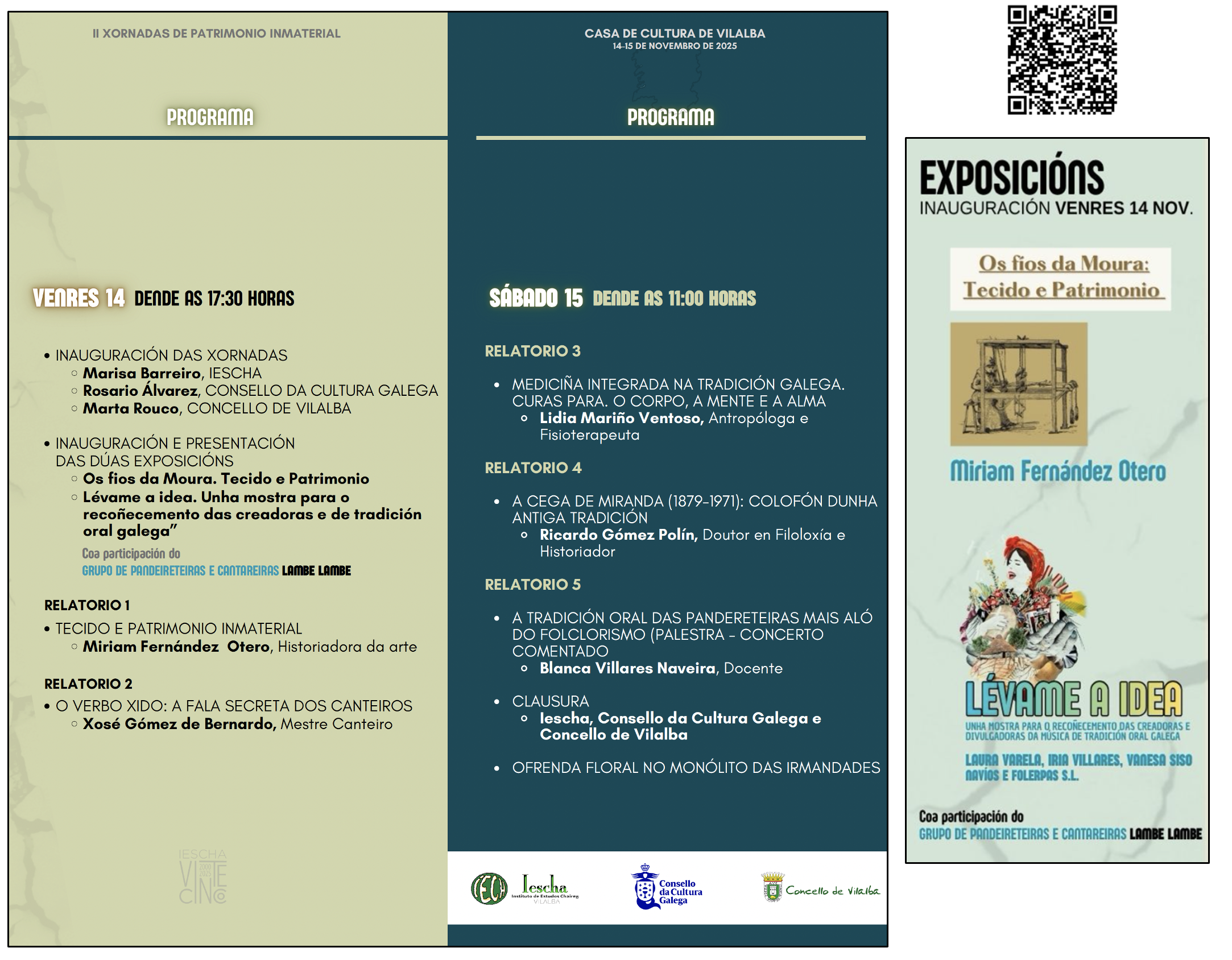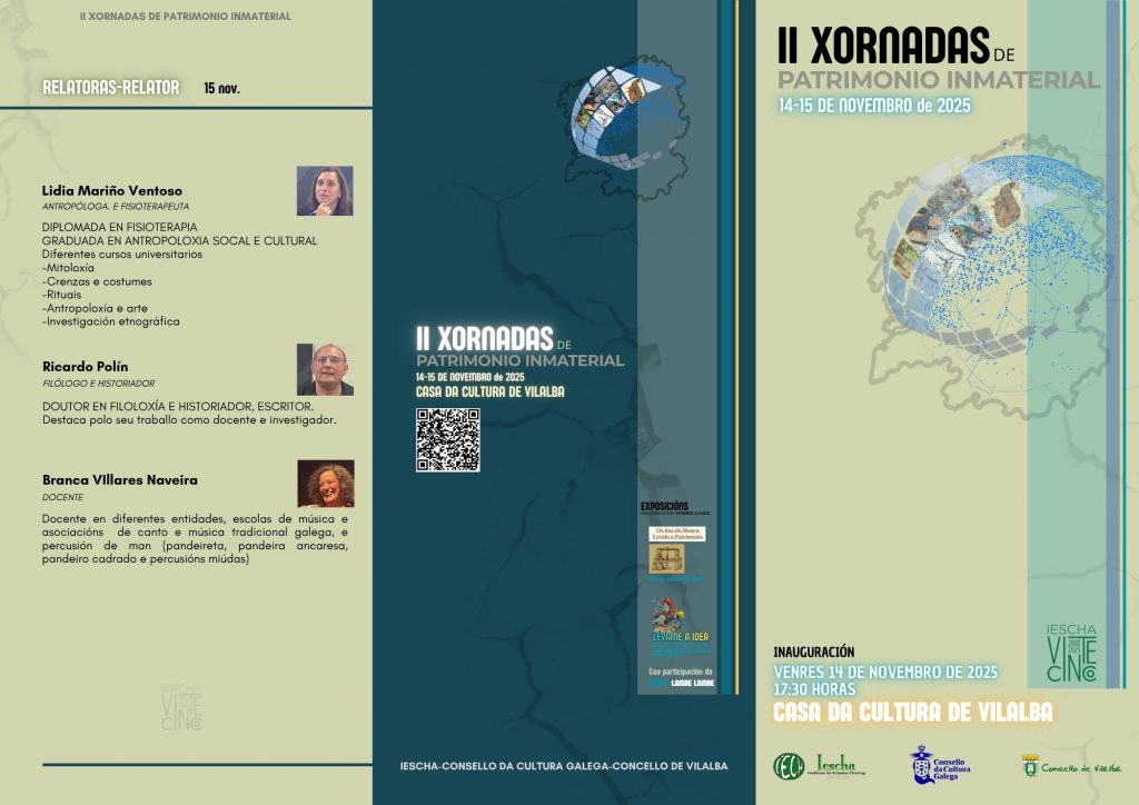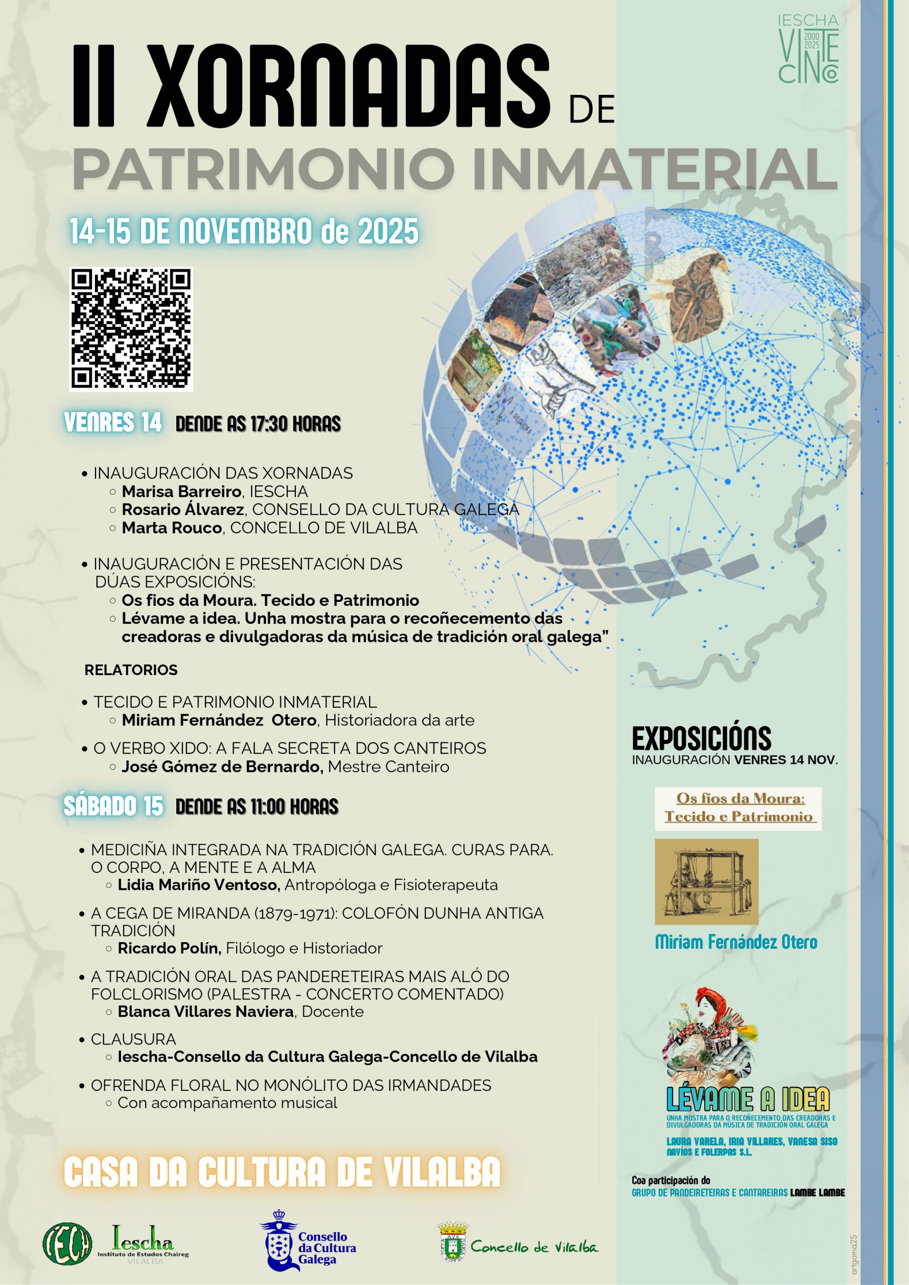 O Instituto de Estudos Chairegos e o Consello da Cultura Galega, coa colaboración do Concello de Vilalba, organizan as II XORNADAS DE PATRIMONIO INMATERIAL que se levarán a cabo na Casa da Cultura de Vilalba, os días 14 e 15 de novembro de 2025.