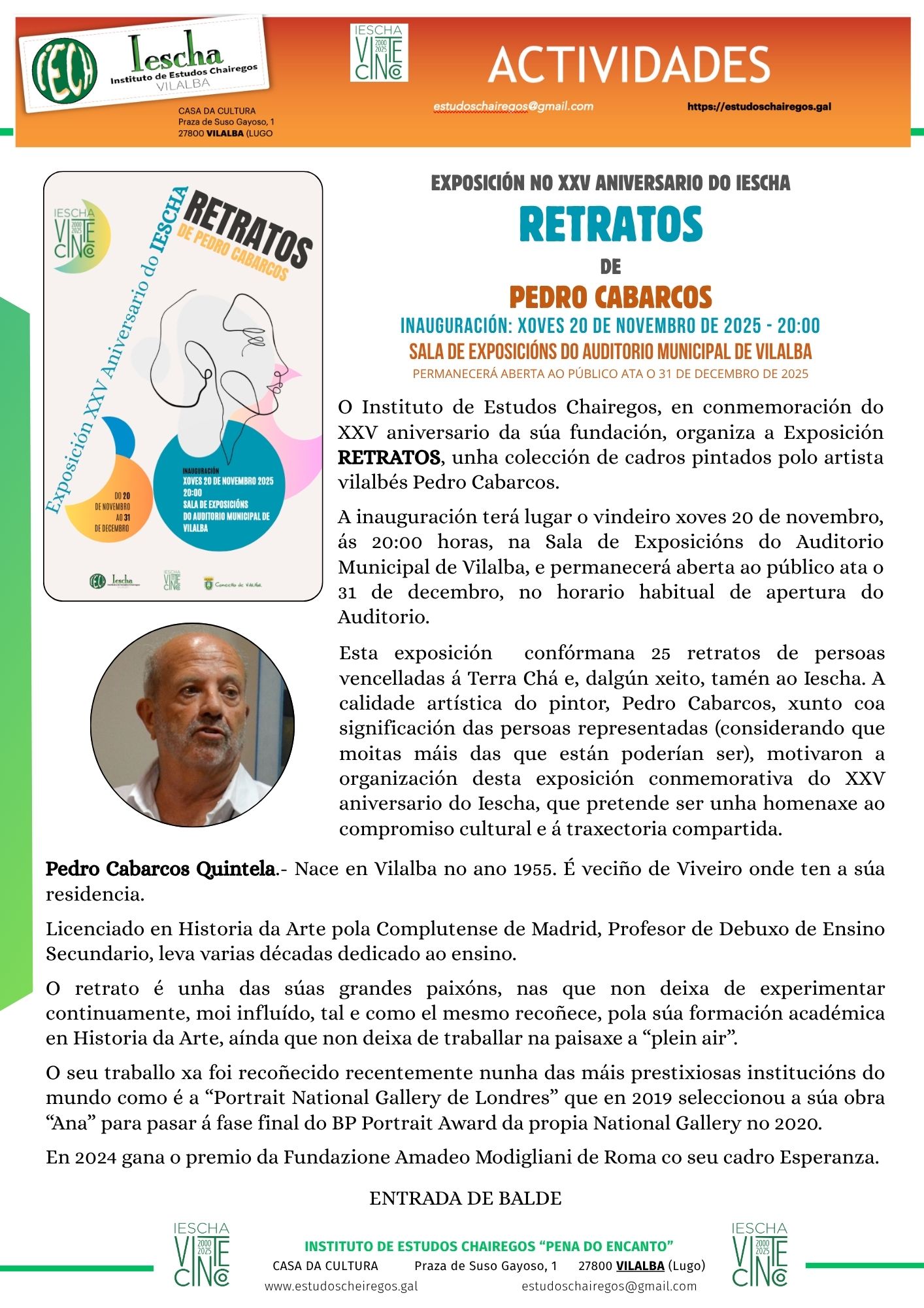 O Instituto de Estudos Chairegos, na conmemoración do XXV aniversario da súa fundación, organiza a Exposición RETRATOS, unha colección de cadros pintados polo artista vilalbés Pedro Cabarcos.