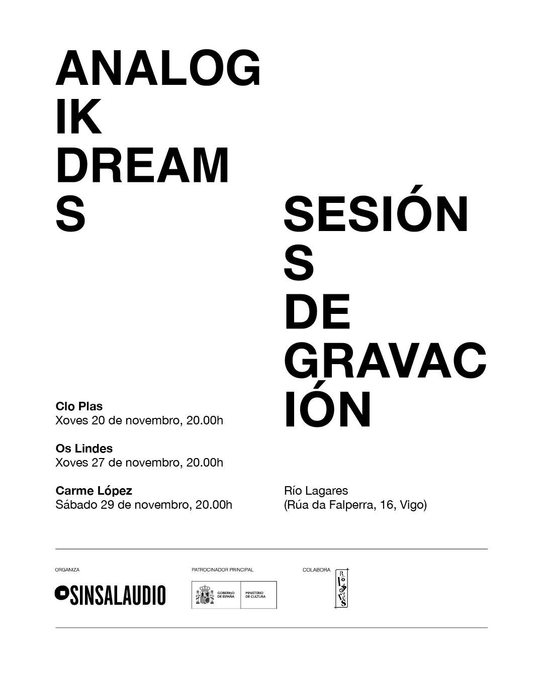 Logo de numerosos meses de traballo e investigación, ANALOGIK DREAMS comeza ser unha realidade co inicio, esta semana, do seu programa de residencias artísticas. Da man do musicólogo Aleks Kolkowski -colaborador habitual de Sinsalaudio e responsable das gravacións das Sesións San Simón- e da ceramista e fotógrafa Olalla Lojo -responsable de Misoco Designs-, o espazo vigués Río Lagares (rúa Falperra, 16) transfórmase ata final de mes nun laboratorio de experimentación artístico e sonoro, no que se fará efectiva a gravación sobre o soporte físico.