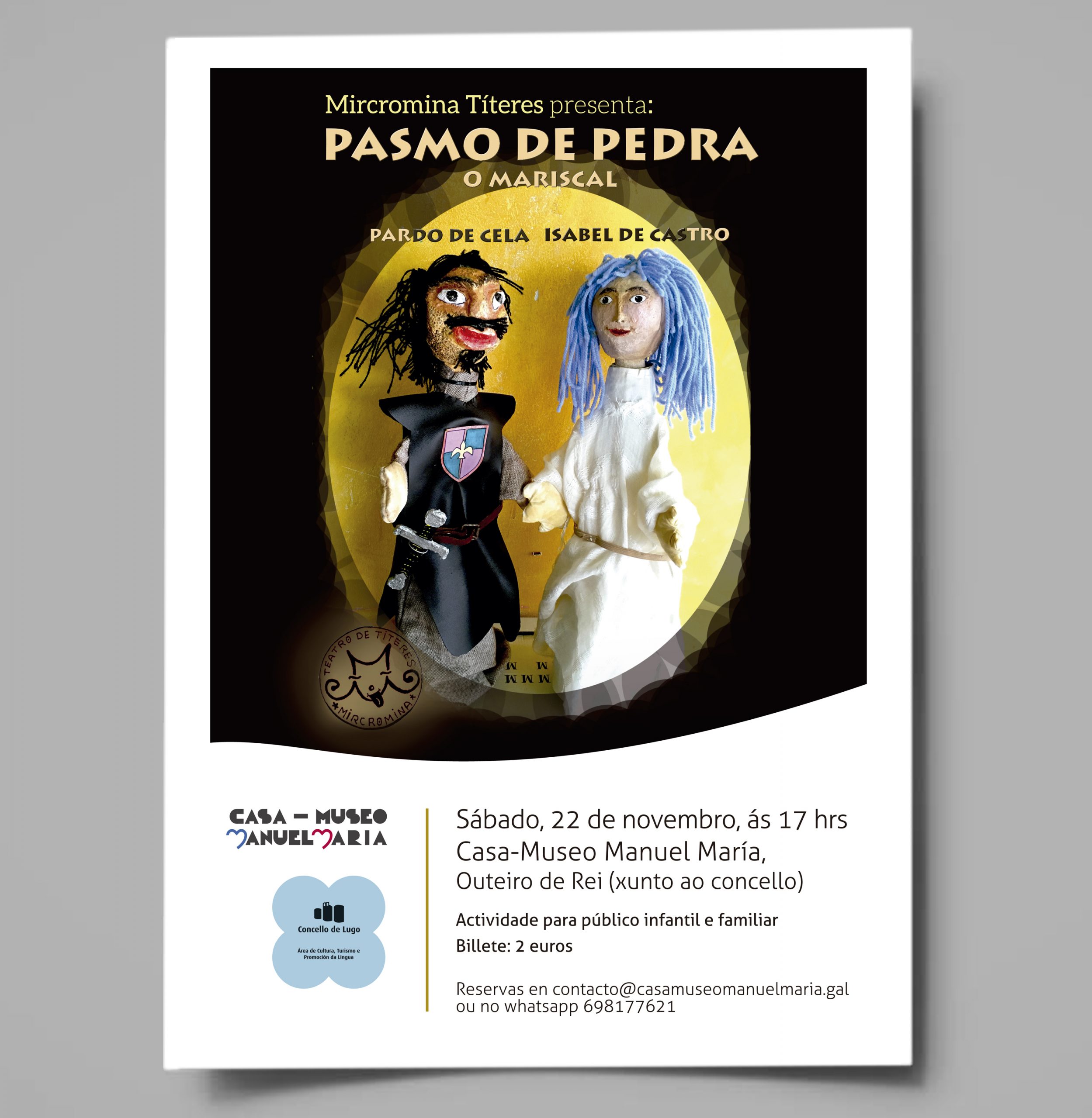 O actor e manipulador mindoniense, Ton Arenas (Mircromina Títeres), leva ao cenario da Casa-Museo Manuel María, para público infantil e familiar, a traxicomedia Pasmo de pedra. Será este sábado, día 22 de novembro, ás 17 horas. Para asistir á representación é necesario reservar (billete: 2 euros) en contacto@casamuseomanuelmaria.gal ou no whatsapp 698177621.