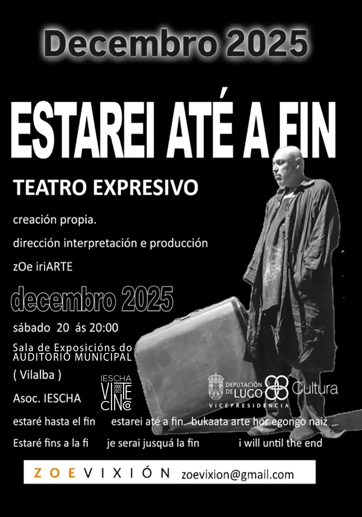 O Instituto de Estudos Chairegos, coa colaboración do Concello de Vilalba, organiza a representación do espectáculo de teatro expresivo ESTAREI ATÉ A FIN, de Zoe Iriarte, a cargo do grupo ZOEVIXIÓN.