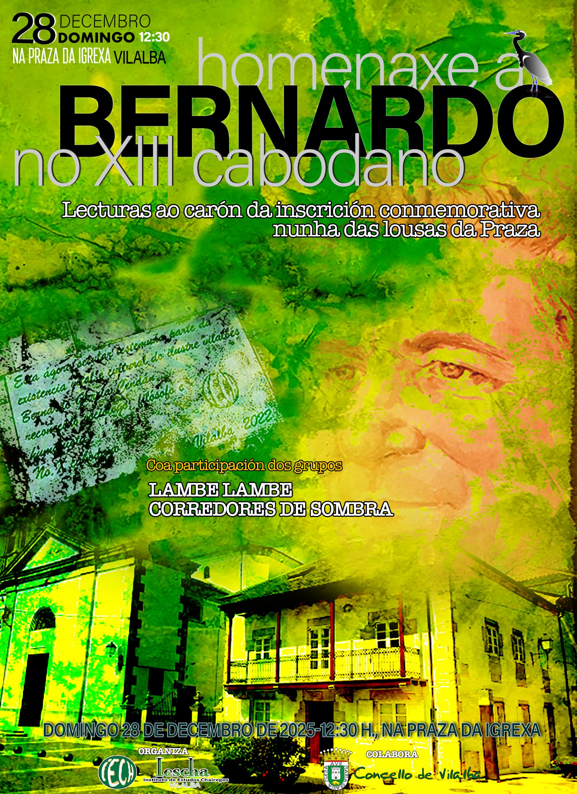 O domingo 28 de decembro de 2025, ás 12:30 horas, na Praza da Igrexa de Vilalba, o Instituto de Estudos Chairegos (IESCHA), coa colaboración do Concello de Vilalba, organiza a homenaxe a Bernardo García Cendán no seu XIII Cabodano, que terá lugar ao carón da lousa coa inscrición conmemorativa inaugurada tres anos (obra do canteiro José Gómez de Bernardo “Pepón”).