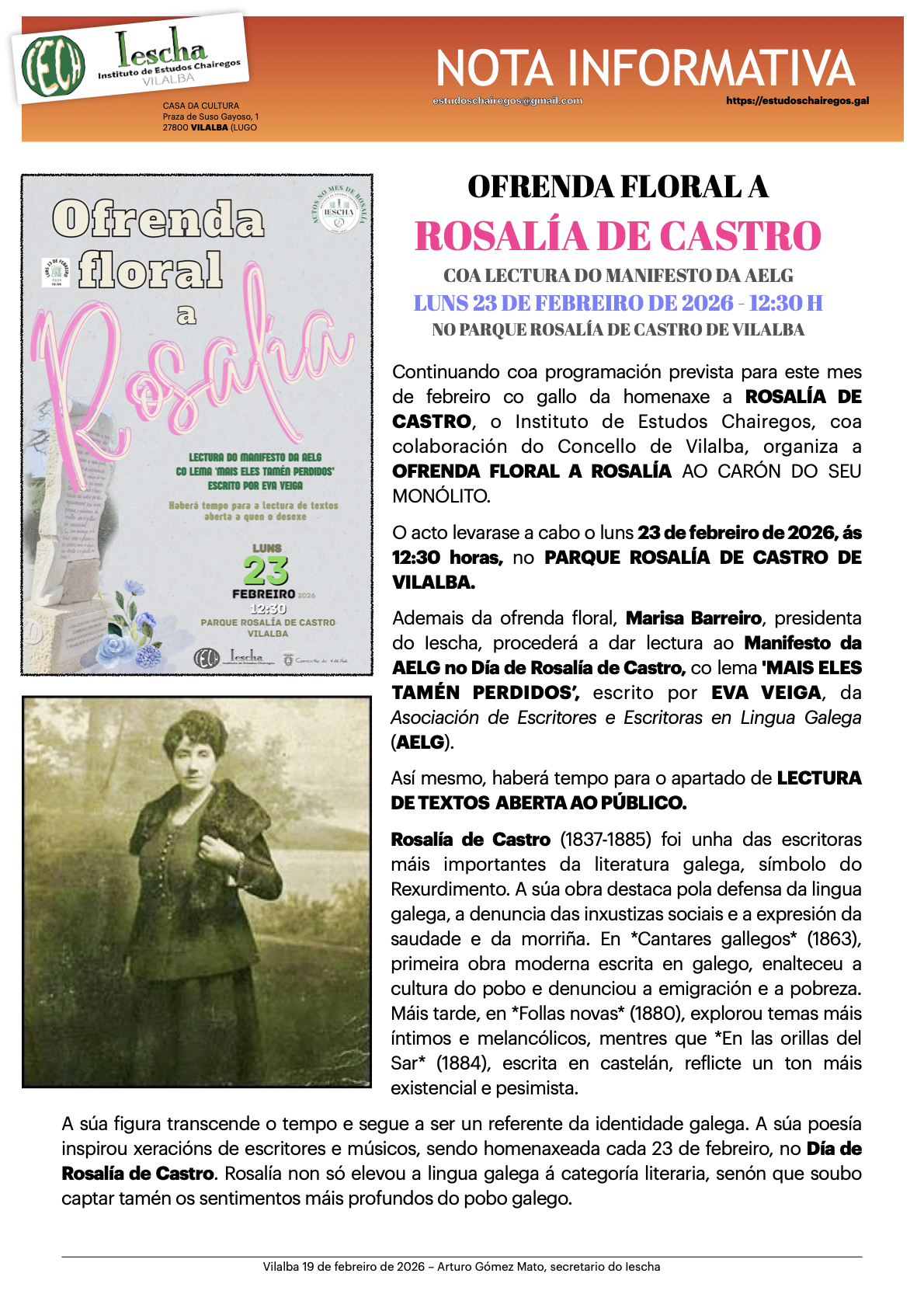 Continuando coa programación prevista para este mes de febreiro co gallo da homenaxe a ROSALÍA DE CASTRO, o Instituto de Estudos Chairegos, coa colaboración do Concello de Vilalba, organiza a OFRENDA FLORAL A ROSALÍA AO CARÓN DO SEU MONÓLITO.